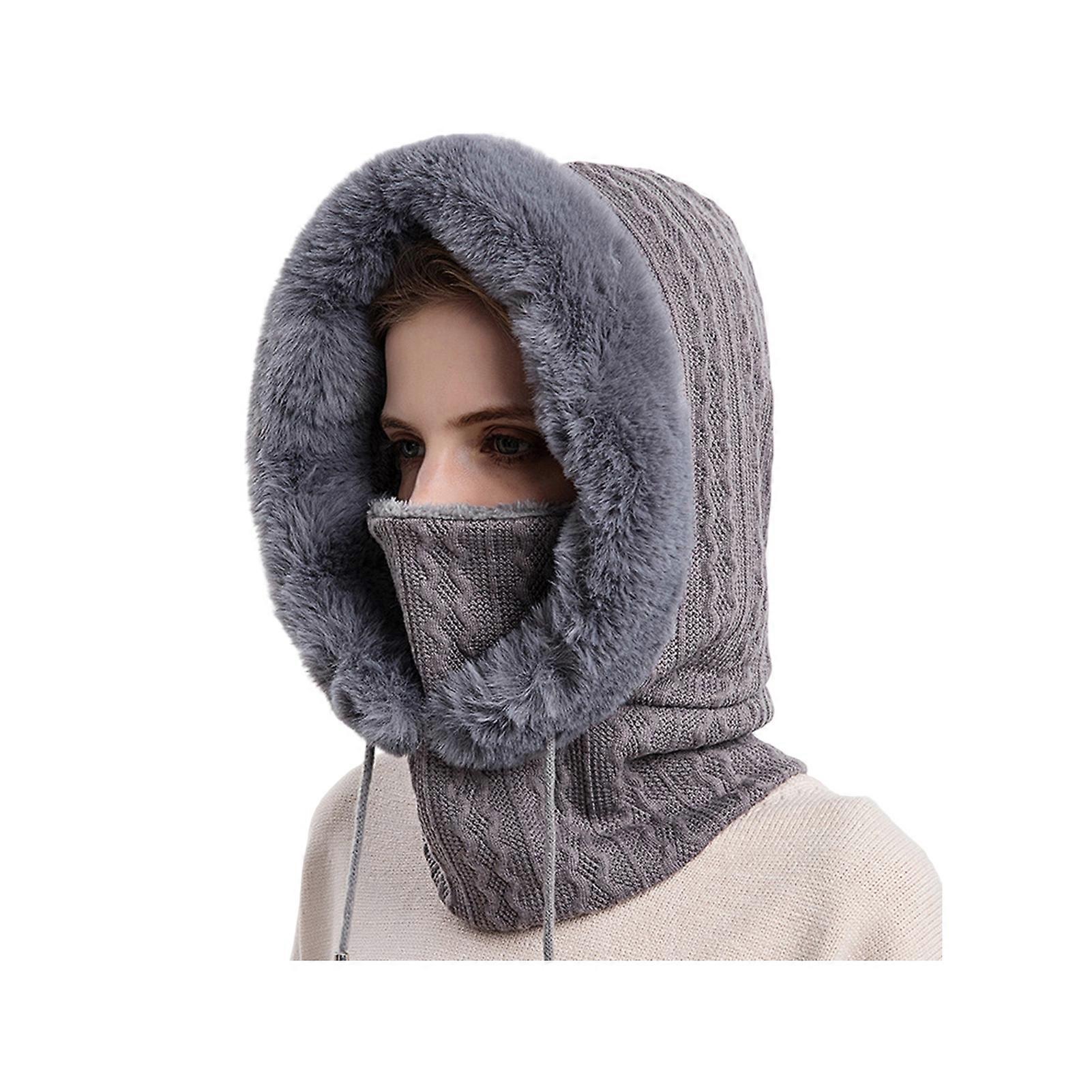 Fleece Lined Knitted Hat Solid Color Plush Trim Adjustable Drawstring 3-in-1 Hat Face Guard Scarf