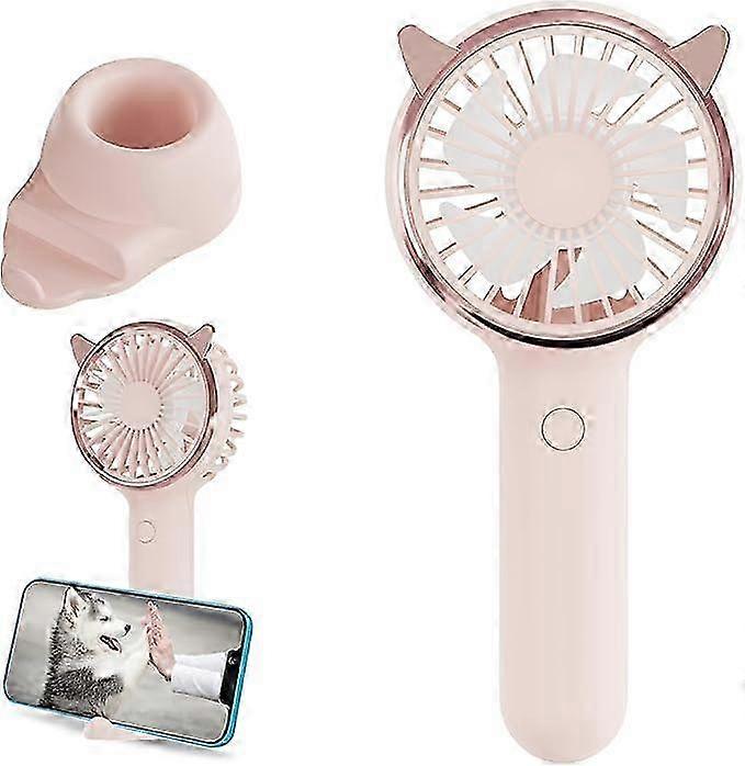 Handheld Fan/Desktop FanThe personal handheld fan base is easily detachable and can be used either as a handy outdoor handheld fan or as a stable, hands-free indoor table fan on your desk. The base of the fan can be used as a mobile phone holder, which is convenient for watching videos. It can also be transformed into a regular desk fan or eyelash fan. Perfect as gifts for women!7 Colorful LightsThis mini fan has 7 colors of lights., which is very cool, unique cat ear design loved by fashionable girls and boys. You can turn on the lights individually without turning on the fan by long pressing the button, it is great for parties, concerts, and adding fun to your life! Easy to Hold Designed with an anti-slip handle that conforms to ergonomic principles, the portable fan is very easy and comfortable to hold even with small hands. Mini size with a narrow fan cover gap is portable and safe for kids. Our fans will bring you the cooling sensation you need to beat the heat and stay refreshed throughout the summer.Pocket Size The small fan weighs 0.15lbs (2.36oz/67g), 1.61*2.6*5.67 inches/4.1*6.6*14.4cm, is incredibly compact and lightweight, weighing even less and being smaller than a typical mobile phone. You can easily throw the mini fan in your pocket or tote bag to take it anywhere. Whether you're working from home, indoors, outdoors, or traveling, it's the ideal companion to keep you coor ol during the summer.Rechargeable Battery OperatedPortable fan with 3 adjustable speeds provides 2 to 6 hours of uninterrupted cooling. It is powered by a rechargeable battery with high efficiency, which will be fully charged in 1 hour. A handheld portable fan can continue to work when it connects with a power supply. Places into the base(included), it can become a normal hand desk fan.