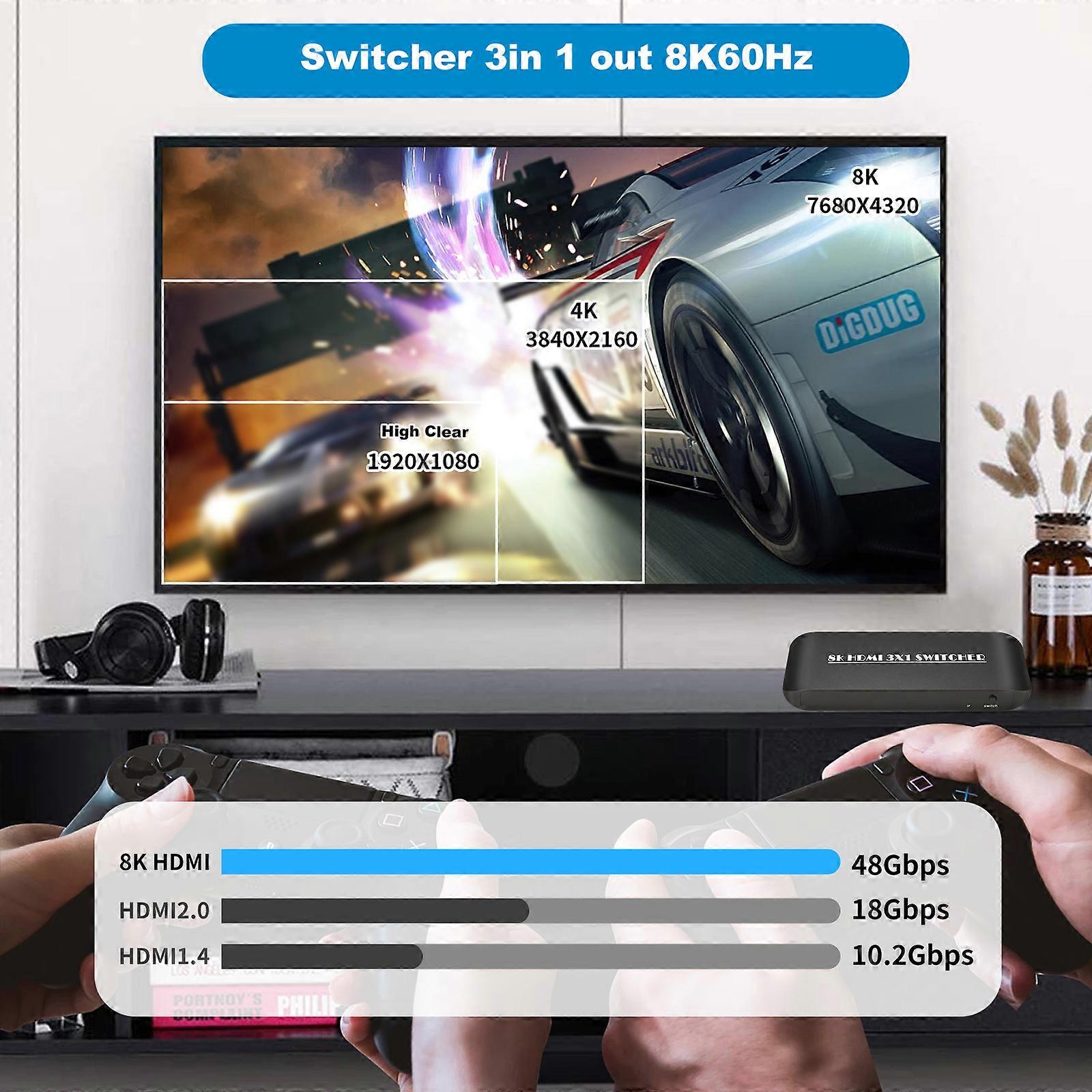 High Definition Multimedia Interface Switcher 8K 3 in 1 Out HD 2.1 Switcher 3 Port with IR Remote Support 8K 60Hz 4K 120Hz HDCP 2.3 for TV Monitor Pr
