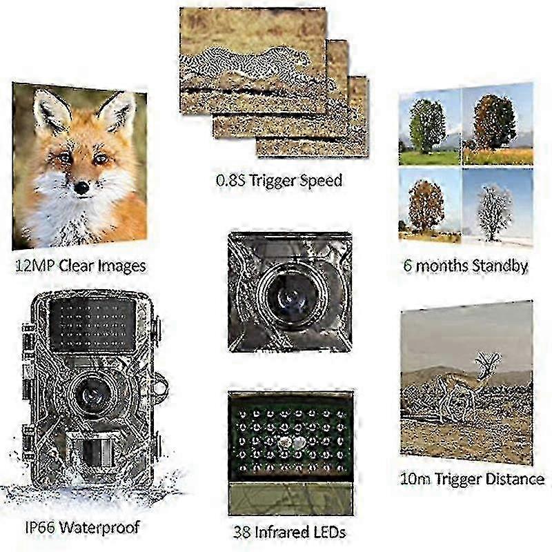 Description Motion Detection: 120 PIR detection angle and an impressive fast triggering speed of 0.8 seconds guarantee that you wont miss any exciting moments as you capture up to 3 photos and 10 seconds video clips per motion detected. Clear Pictures and Videos: Trail and gaming cameras can capture clear 12MP color photos during the day (black and white at night) and 1080P videos with sound. IP66 Waterproof: The robust construction can withstand extreme outdoor temperatures from -20 to 70 C and offers IP66 waterproof protection. It can be placed outdoors for a long time and is widely used in hunting, wildlife observation, home security, surveillance and more. Night Vision: 38 black infrared LEDs provide night vision capabilities, making the camera an invisible device that does not invade natural habitats. Please note: Our products do not include German manuals. Note: Due to the light and screen setting difference, the item's color may be slightly different from the pictures. Please allow slight dimension difference due to different manual measurement. Sold by-Minnanxin