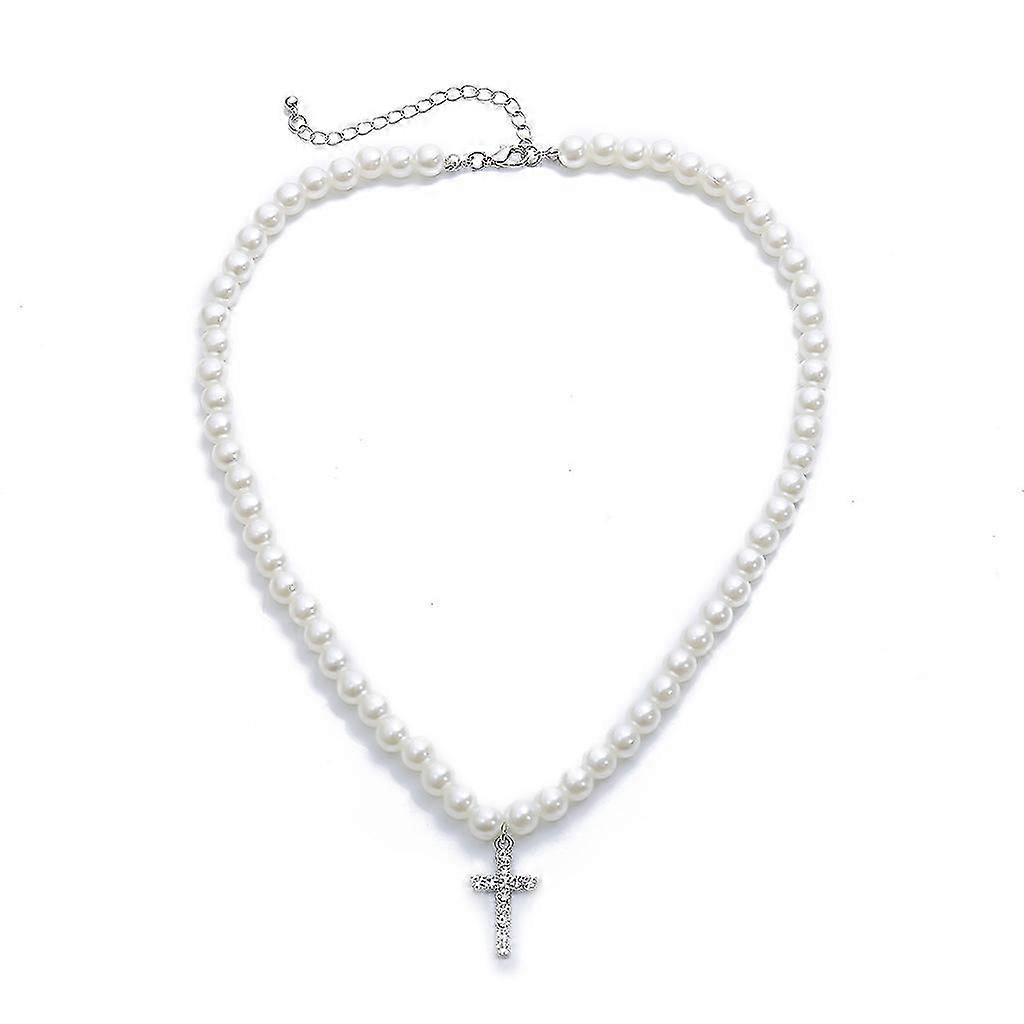 JiaWei Vintage Pearl Necklace Crystal for Cross for Rhinestone Pendant Simply Pearl Bea cLl