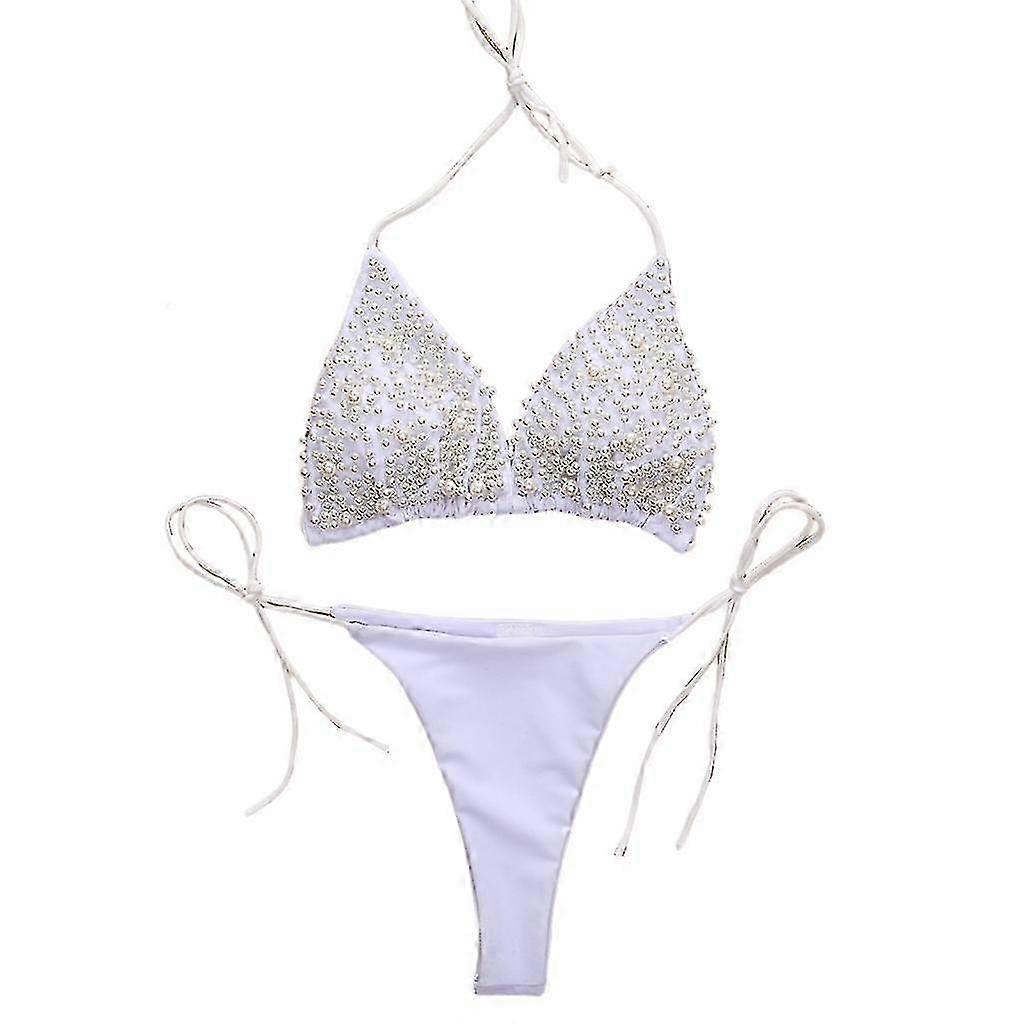 JiaWei Two Pieces Tie Side Bikinis Set Pearls Swimsuit Lace Up Bathing Suit For Women 76v