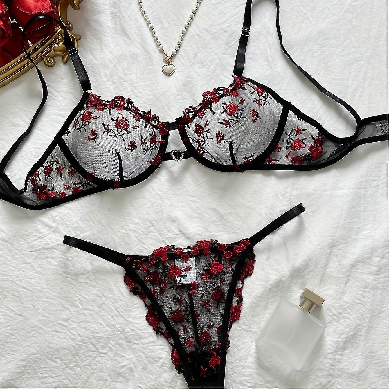 JUEGE* Floral Embroidery Lingerie Set, Hollow Out Unlined Bra & Sheer Mesh Thong, Women's Sexy Lingerie & Underwear