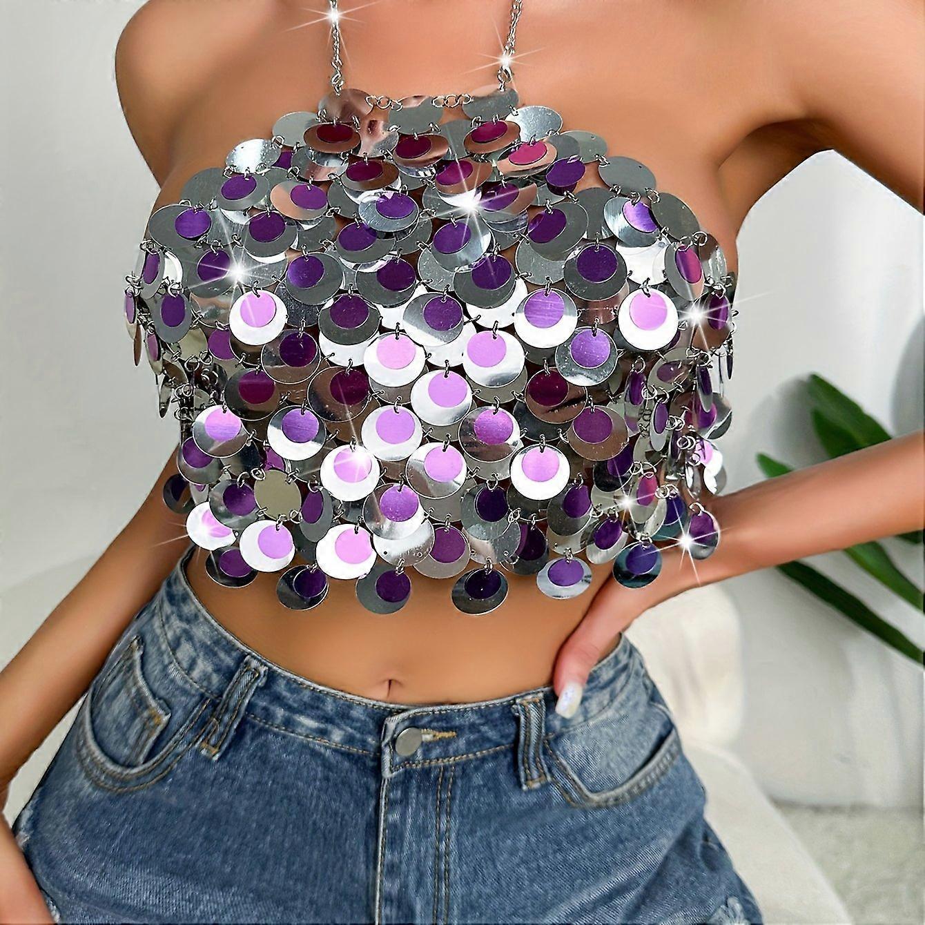 JUNGE Contrast Sequin Halter Top, Club Wear Nightout Chain Strap Backless Crop Top, Women's Clothing SZJG240306