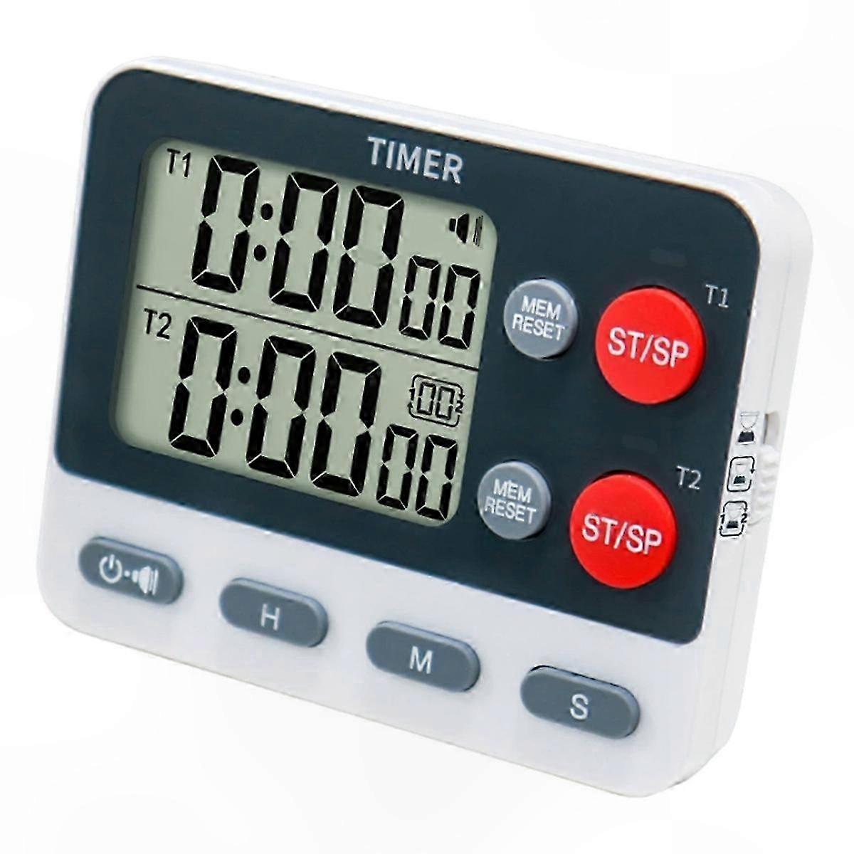 Features: 3 major modes: Independent timing: two groups of timing forward/backward, each group can be timed up to 9 hours, 59 minutes and 59 seconds Two independent cycle countdown timing: automatic cycle up to 99 times, with count display Two alternate cycle countdowns: alternate cycle up to 99 times, with count display 3 storage memory function: each group has three independent memory time, different modes can also be customised memory time Mute/shutdown function: short press loud, soft, mute have flashing light prompts, long press can shut down; fully applicable to fitness, learning, cooking and other scenes. Specification: Name: Dual Groups Recyclable Timer Volume: Loud/Low with Mute Material: ABS Mirror: Acrylic mirror Power supply: 2 AAA batteries (batteries not included) Net weight: 75g Size: 93 x 73 x 21mm Color: Gray Function: Independent positive/reverse countdown, independent cycle countdown, alternate cycle countdown, 3 storage memories Package Contents: 1 x Kitchen timer Only the above package content, other products are not included. Note: Light reflection and different displays may cause the color of the item in the picture a little different from the real thing. The measurement allowed error is +/- 1-3cm.