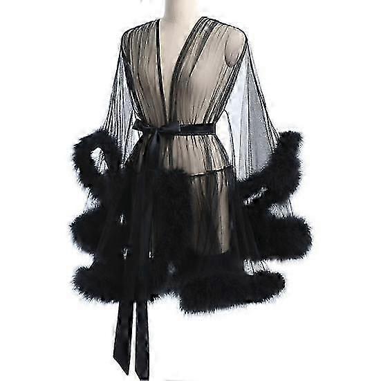 Lady Nightgown Plush Trim Ultra Thin See-through Mesh Ruffle with Adjustable Waist Tie Solid