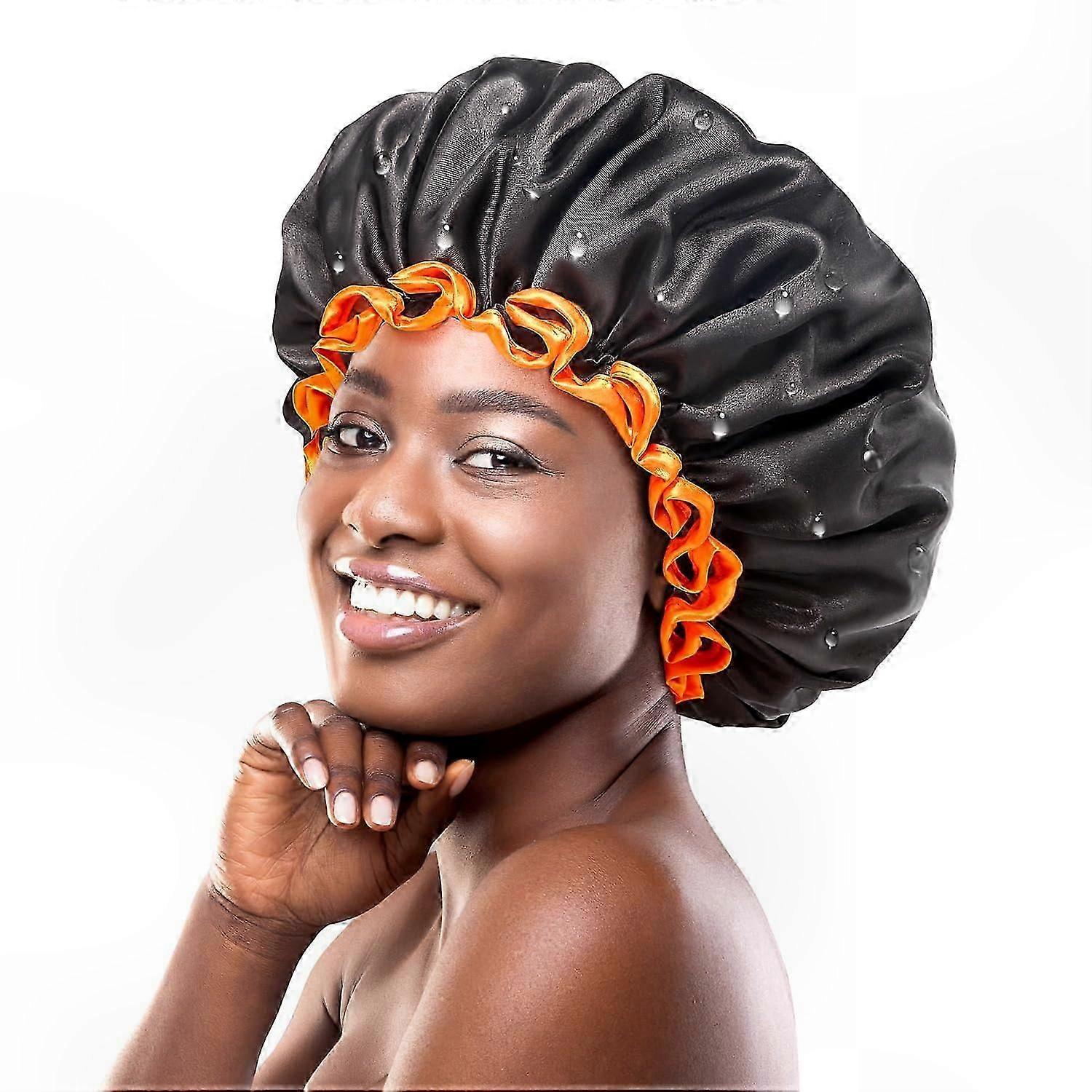 Large Reusable Waterproof Shower Cap, Black with Orange Edge, Double Layer Washable Colorfast Odorless