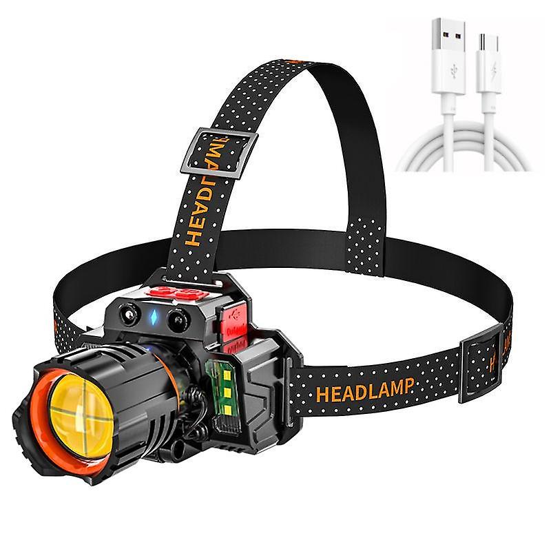 Material: ABS+Aluminum Alloy Power supply mode: 1*18650 battery (built-in) Charging method: USB charging Lighting mode: main light-high light/main light-low light/main light-Strobe-side light-on-main side light all bright Waterproof rating: IP65 (not for diving) Using 4-core XHP50 lamp beads,, and the maximum lighting distance can reach 500 meters. It can easily illuminate a building and is your best choice for outdoor adventures. Built-in sensor, after turning on the sensor mode, you can turn on the light with a wave of your hand, freeing your hands.(Sensor type) Support zoom: Stretch the head to zoom, suitable for lighting in different scenes. Waterproof design: IP65 waterproof level, it can be used normally in rainy days, but please do not use it for diving.