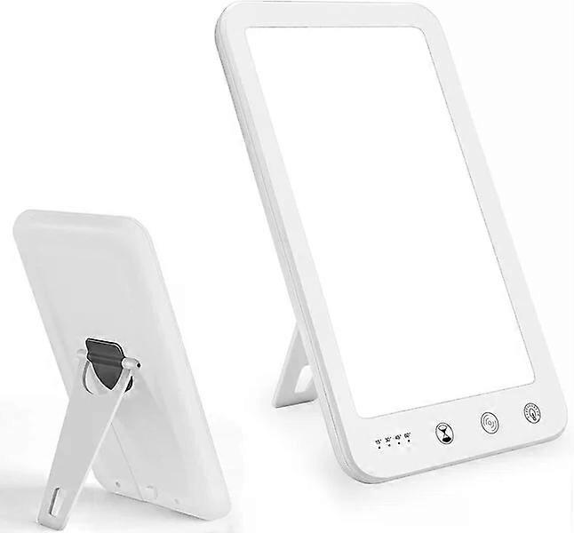 ①. UV-Free LED Light: The daylight lamp simulates the full spectrum of daylight and emits a recommended intensity of 10,000 lux to emit 6500K light that helps you stay energized and focused. ②. Swivel Mount: Rotate the tripod 90 degrees for portrait or landscape use, and adjust the opening angle from 40 to 100 degrees to place the light where you need it. ③. 30 - Minute Timer and Memory Function: Press the power button for 2 seconds to start the 30 - minute timer and the LED indicator will flash (press and hold a second time to cancel the timer); The memory function helps you quickly turn on the light from the last brightness setting. ④. Adjustable Brightness Levels: When the dimmer is continuously adjustable (10% - 100%), you can set a suitable level by pressing the (+/-) button for 2 seconds, depending on the environment and the distance from the lamp to the daylight. ⑤. Ultra - thin design: Extra large and lightweight surface and ultra - thin size (8.7 * 6.7 * 0.4 inches) for easy placement in small spaces and storage, such as next to your laptop, on your kitchen counter and anywhere else. ⑥. Product Description Features: - Full - spectrum light: HappyLight Lucent provides light up to 10,000 lux to give you a daily dose of sunlight. - Evenly distributed LED light: Enjoy a beautiful, flicker - free and glare - free light with 72 LED bulbs, without hot spots. - Simple and easy to use: Touch - sensitive on/off button makes it easy to operate. - Portable and durable: Detachable stand and case are designed for your mobile lifestyle. - Safe for eyes and skin: Our full - spectrum UV light has passed internationally recognized vision safety tests. ⑦. Personalize your use: The Daylight Luxe light therapy lamp can be adjusted individually for time, proximity, and brightness, so you can maximize your comfort by choosing settings that work well for you. ⑧. Choose a location: The recommended location for the Daylight Luxe light therapy lamp is up to 24° from your face. Use the therapy light for 20 - 60 minutes to benefit from the bright light of up to 10,000 lux! The closer the Daylight Luxe is to your face, the less you need to use it, and vice versa, the further away you place it. ⑨. What you get: - 1 X Daylight Luxe light - 1 X Charging adapter - 1 X User manual