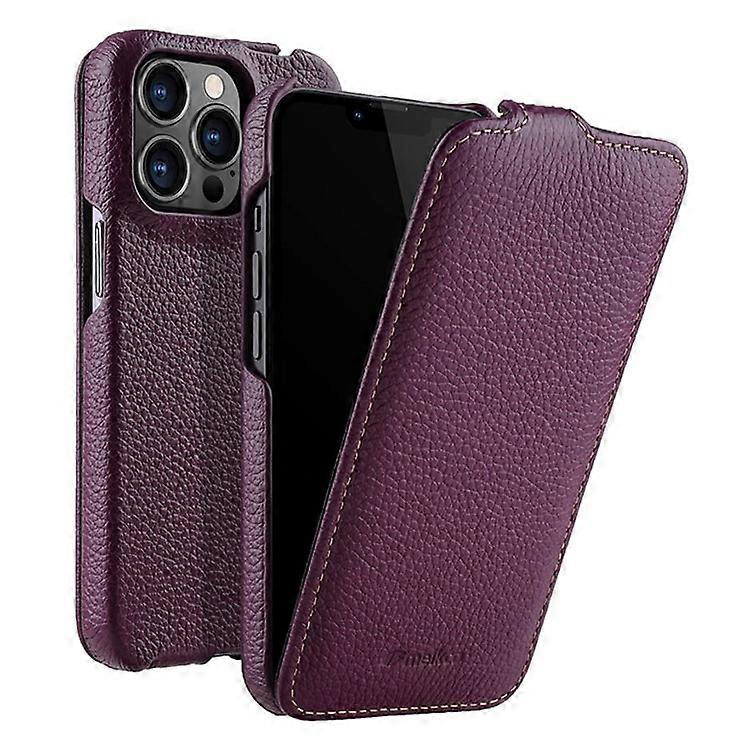 MELKCO Compatible For iPhone 14 Pro Max Genuine Cow Leather+PC Cover Litchi Texture Vertical Flip Protective Phone Case