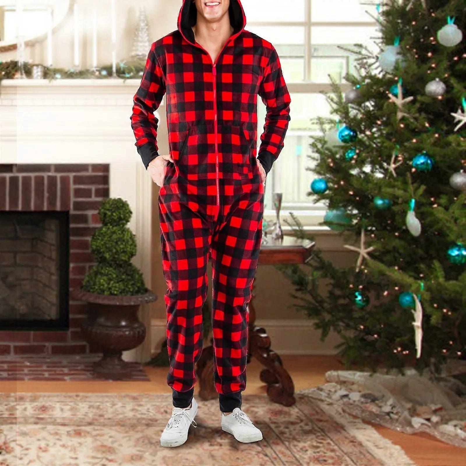 Onesies Men Plaid Christmas Elk Print Zipper Thick Fleece Hooded Jumpsuit Navidad Hood Pyjamas Nightwear Onesies