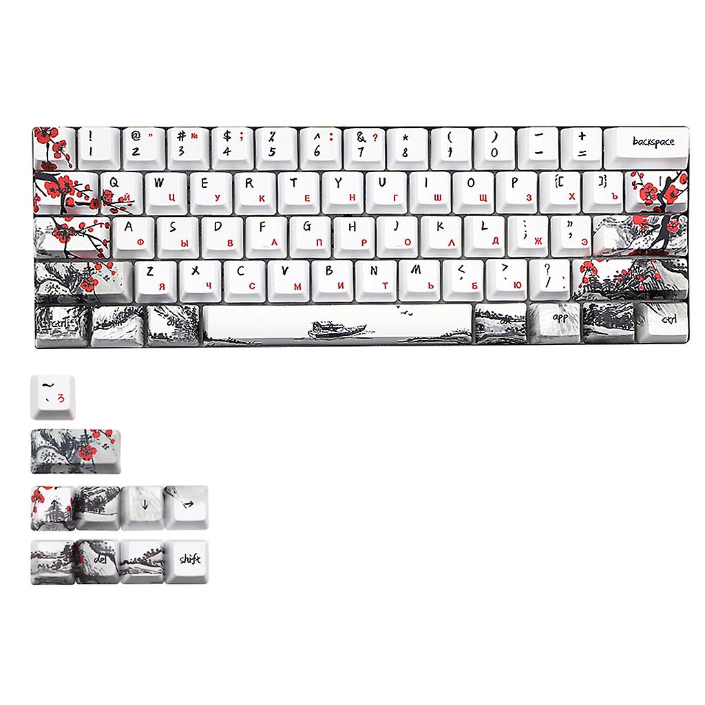 Features: This keycap set contain 71 keycaps, a good choice for you to DIY your mechanical keyboard. The PBT keycaps provide top-notch durability and a great feel for your typing, high color fastness, wear resistance, and no fading. There are three different languages Japanese/Korean/Russian for you to choose, with very beautiful Chinese Plum Blossom theme. Ergonomic design, elegant landscape and unique design can better decorate your keyboard. Exquisite workmanship, easy to install and use. Specifications: Material: PBT OEM profile Weight:133g /0.29lb Pattern: Plum Blossom Package Size:30X15cm/11.81X5.90in Note: Due to the problems of lighting effects and shooting angles, there will be certain tolerances in the product, please understand. Please allow 0-2cm error due to manual measurment. Only the keycaps,no keyboard included. Package includes: Totally 71 Kaycaps included