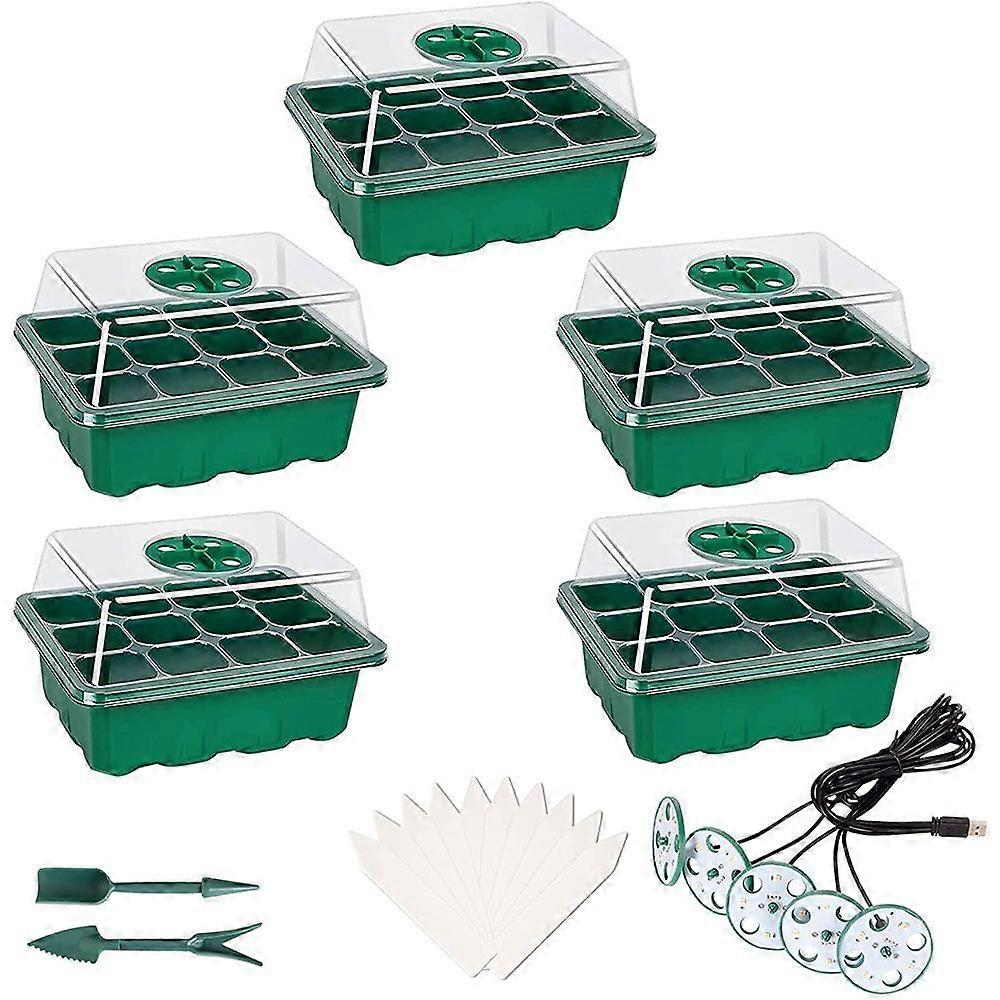 NEW DESIGN: Enhance your plant growth with our innovative seed starter trays featuring a built-in plant growth light on the top lid. This light promotes photosynthesis, leading to rapid, natural growth and abundant harvests for your plants. MATERIAL: Our seed starter trays are crafted from high-quality, durable plastic that is reusable. The clear lid allows you to easily monitor the germination and growth of your seeds, making it perfect for any gardening enthusiast. HUMIDITY CONTROL: Each seed tray lid is equipped with an adjustable air hole, allowing you to control humidity levels within the box. This feature promotes optimal air circulation and supports healthy seed growth. Additionally, the bottom of each cell includes drainage holes to prevent overwatering, ensuring that your plants' roots remain healthy and free from rot. SIZE: Measuring 7.28"L x 5.7"W x 4.3"H, each of the 12 cells is perfectly sized at 1.5" x 1.5", making them ideal for starting flowers, vegetables, fruits, and more! 5 PCS PACKAGE INCLUDES: - 5 x Seed Trays - 5 x Bottom Trays - 5 x Plant Growth Lights - 1 x USB Cable - 2 x Garden Tools - 10 x Plant Labels Transform your gardening experience with our comprehensive seed starter kit!