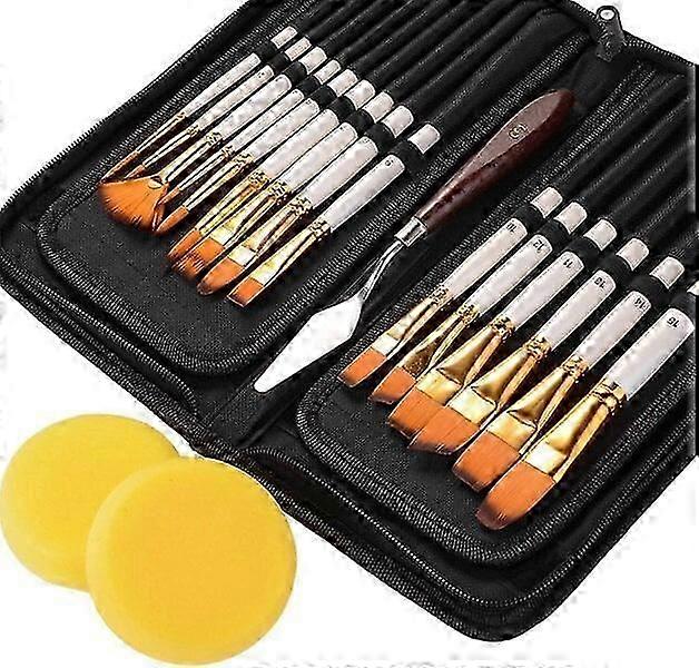 ①. Brush set composition: The brush set includes a total of 15 different brushes in different sizes and shapes, such as round, flat, angled brush, hazelnut, coating, to meet various needs. Users can always find a suitable brush for their painting style. ②. Comfortable brush handles: The brushes have wooden handles and are exquisitely crafted. Each brush is sturdy and durable. The handles fit comfortably in the hand, are not prone to bending, and do not break even with repeated daily use. ③. Carrying bag with pop - up stand: The set comes with an elegant black case to store all the brushes. It is a soft - closing container that is easy to carry around. It can also be used as a pop - up stand, enabling users to change brushes easily while working. ④. Durability: The bristles of each brush are made of soft and synthetic nylon material. They are soft, flexible, and not easy to fall out. Even after multiple washes and uses, the brushes can keep their original shape. ⑤. Great choice: With this brush set, users can get basic equipment for creative painting. It is suitable for oil painting, watercolor, acrylic painting, face painting, etc. It is suitable for artists, students, teenagers, children, and beginners. This set can also be a good gift. ⑥. Product Descriptions Key Features: - The brushes have excellent water absorption with fine brush tips, smooth painting traces, and good liquid - holding capacity. They can maintain a good shape after each use. - 18 packs are stored in a zippered nylon sleeve. Independent slots keep these art brushes safe and tidy, reducing the worry of damaging the brushes or making the desktop messy. - These brushes are easy to clean. Just run them under warm water to rinse off the paint and gently wipe the brushes with fingers. - It is a good gift for any artist and those who love to paint. It is also suitable for birthdays, Christmas, New Year, and other holidays. ⑦. Specific features: - Handle color: white - Hair color: gold - Hair material: Synthetic nylon - Hair Handle material: Polished wooden handle and clad copper tube - Total length: approx. 19 - 22.5 cm (including the length of the hair tip) ⑧. Package contents: - 15 x brushes - 1 x spatula - 2 x sponge - 1 x brush holder / black case ⑨. Note: A small number of brush hairs may fall off, which is normal and does not affect use.