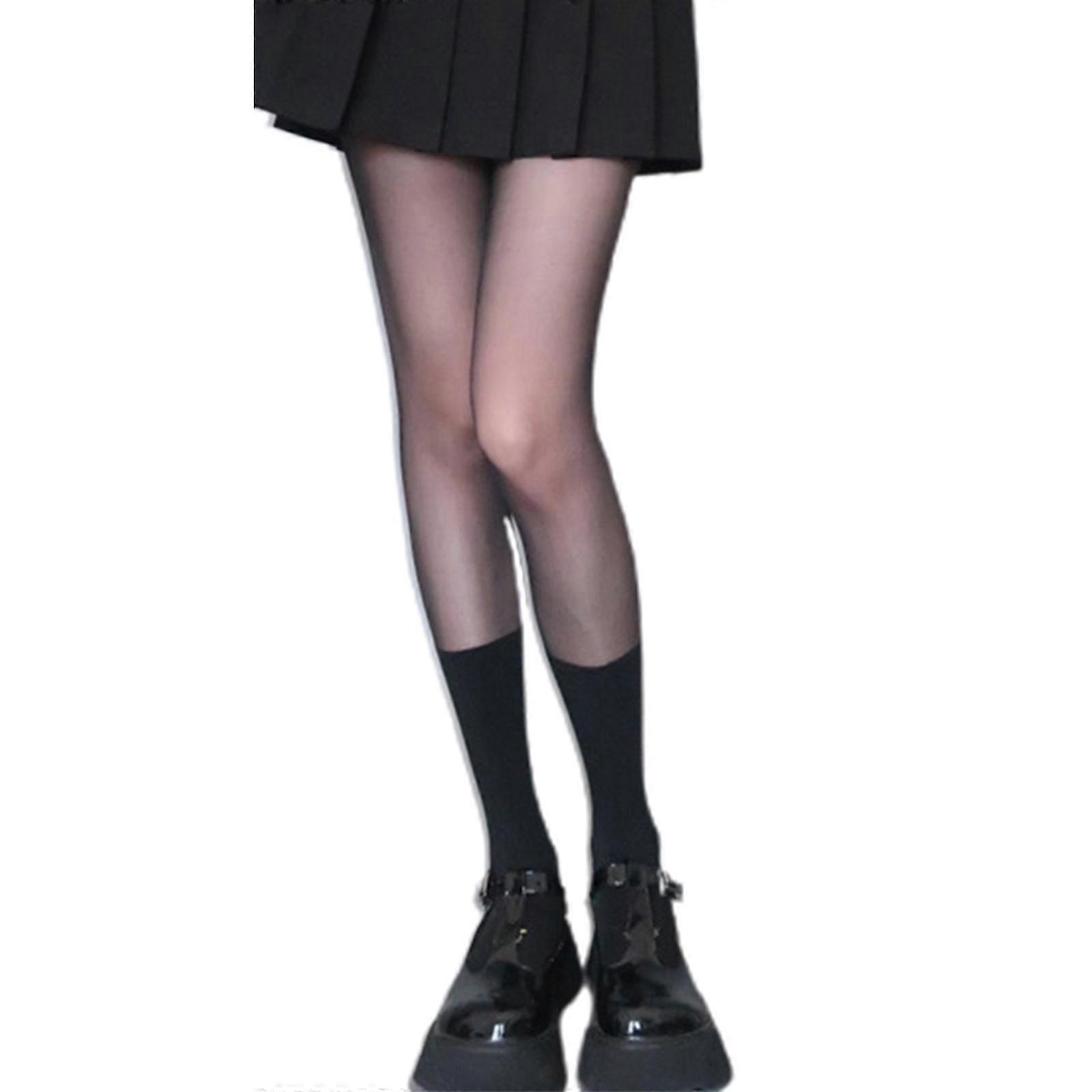 Preppy Style Women Student Silky Pantyhose Faux Over Knee High Tube Stitching Patchwork Sheer Tights Mock Suspender Stockings Leggings Hosiery