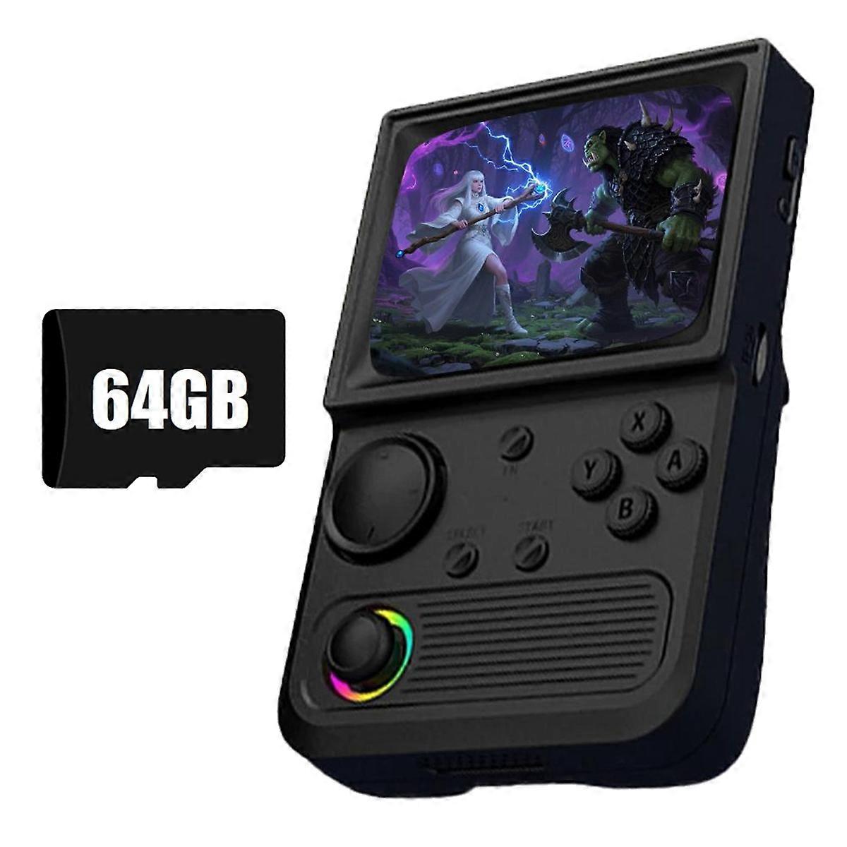 1. Support two-player : Built-in WiFi, no additional OTG adapter required. Fight with friends and enjoy playing party games. 2. upgrade, built-in flash memory system: Use onboard storage, no TF card required, say goodbye to card damage and startup failure 3. Intelligent battery life: Low-power sleep mode can extend standby time, allowing you to restart from where you disconnected at any time. 4. Colorful ambient light: Customized light mode enhances the gaming atmosphere 5. Plug and play, worry-free gaming: Built-in for licensed games Product name: R36T retro handheld game console Memory style: 64G Video/audio interface: OTG Interface type: USB System memory: 1GB System: EMuEMEC CPU: Quad-core, -A35, 1.5GHZ Screen: 3.5 inch 640*480 IPS HD Battery: 3000mAh LAN: 2.4G Color:Black Material:plastic Package Contents: 1 * Game Console Only the above package content, other products are not included. Note: Light reflection and different displays may cause the color of the item in the picture a little different from the real thing. The measurement allowed error is +/- 1-3cm.