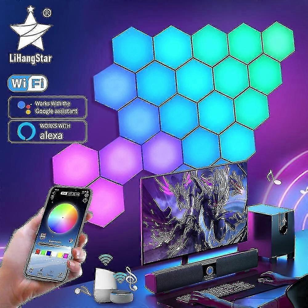 Bluetooth: APP control, remote control, music synchronization WIFI: APP control, remote control, music synchronization, voice control The WIFI version is compatible with popular voice assistants such as Google and Alexa, and can be controlled by voice. If you need to use a power adapter, please use 5V-2A Power Adapter. Otherwise, the battery may be insufficient. Specifications Product name: Color-changing seven-color light quantum lamp Product material: Acrylic Control: APP control or remote control Color: RGB Symphony: 1 year Features Dream color rainbow effect: Our dream color technology allows the hexagonal light panel to dynamically display multiple colors at the same time . Interesting built-in modes: Hexagonal LED lights with RF remote control, you can enjoy 60 preset scene/music modes, dimming, speed, music/sound activation and timing functions. Auto mode switches lightning effects among 60 scene modes, including automatic chase and crossover scenes. DESIGN YOUR OWN SHAPES: Use these red, green, and blue hexagonal fantasy lights to create fun geometric LED patterns. The hexagonal LED light wall uses advanced LED lights to create vibrant colors that stand out in the dark. COOL SETTINGS: The hexagonal rhythm lights are perfect for home decor and wall art, creating a fun and lively atmosphere in your bedroom, living room, playroom, and kids, teens, girls, babies, and gamer rooms. Add a special touch to birthdays, Valentine's Day, Halloween, Christmas, proposals, dinner parties, shows, weddings or any parties and other events. The package contains USB cable*1 remote control*1 instruction manual*1 quantum light (depending on the quantity purchased) Note: the remote control does not include batteries