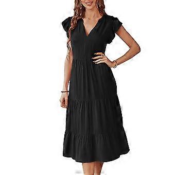 المرأة فستان طويل V الرقبة قصيرة الأكمام كشكشة تنحنح لون نقي عارضة فستان للارتداء اليومي