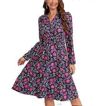 Women's Comfortable Girls' Dress with V-neck Button, Mid-length Long Sleeve Prints