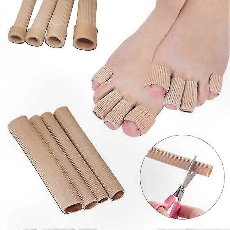 1. ERGONOMIC DESIGN FOR TOE AND FINGER PROTECTION: Helps protect against blisters, corns, and calluses. These stretchable, comfortable toe tubes reduce pain and friction on toes and fingers. Ideal for bunion and hammertoe protection, the medical-grade gel lining helps hydrate and soften skin, supporting healing and reducing irritation. 2. CUSTOMIZABLE FIT WITH EASY TRIMMING: Soft, fabric-coated tubes can be easily cut with standard household scissors for a personalized fit. Designed to fit most sizes, they can be worn with or without socks. Due to their width, many users choose to cut them in half, effectively increasing the number of uses. 3. LATEX-FREE AND HYGIENIC MATERIAL: Covered in soft cotton fabric and lined with latex-free, medical-grade gel, these toe tubes provide gentle cushioning for sensitive toes. The smooth gel surface helps prevent slipping during use. Tubes are easy to clean and maintain. 4. SET OF SIX REUSABLE TUBES: Includes six reusable toe tubes with a slight stretch for easy application on most toe sizes. A convenient storage pouch is included for safekeeping.