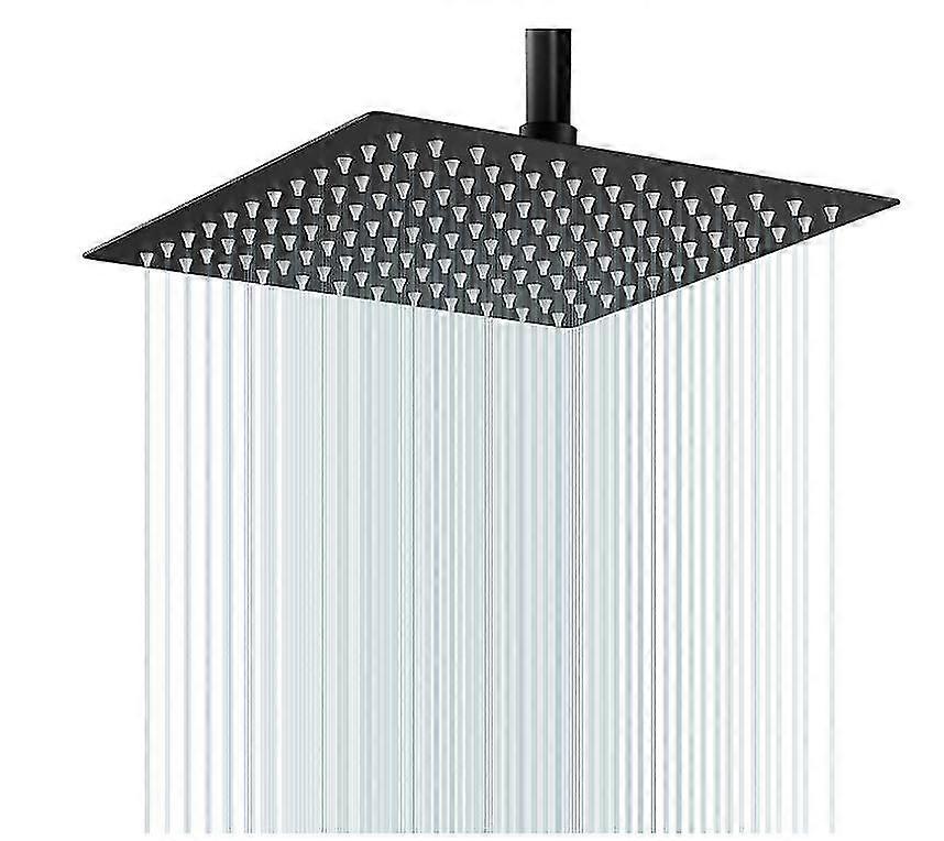 EASY INSTALLS - Fits all standard G1/2" pipe threads. Easy installation in wall-mounted or ceiling-mounted shower arms without any tools in several minutes.INCLUDED WATER FLOW REGULATOR & 5 REPLACMENT NOZZLES & TEFLON TAPEULTRA THIN & HIGHPRESSURE WATER FLOW 0.08 inch thick and air-in technology, which make the Square Shower Head is strong and high pressureoptimized for any water pressure, Super large with 12 by 12 inch,full cover the body, just like full and dynamic massage to your skin.LEAK PROOF AND RUST RESISTANCE The Shower rainhead is made of high quality solid stainless steel with Matte Black Finish, ensuring durability and dependability, makes the item rustproof and corrosion from daily use. To prevent leaking, we use the best soft rubber gasket and teflon tape.SELF-CLEANING SOFT SILICONE NOZZLES The self-cleaning design of 256 silicone nozzles keeps health and save your time. Food-grade silicone for the nozzles, make sure your safety and health when you enjoy bathing.