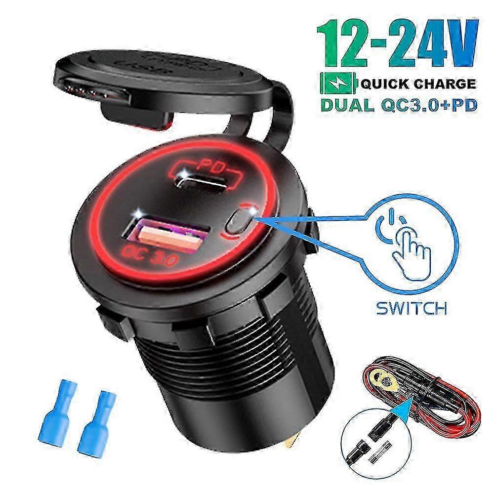 USB Type C Dual Port Car Motorcycle Boat Charger Socket QC 3.0 PD Fast Charge Auto Power Adapter with ON/Off Switch 12-24V Universal Blue Light