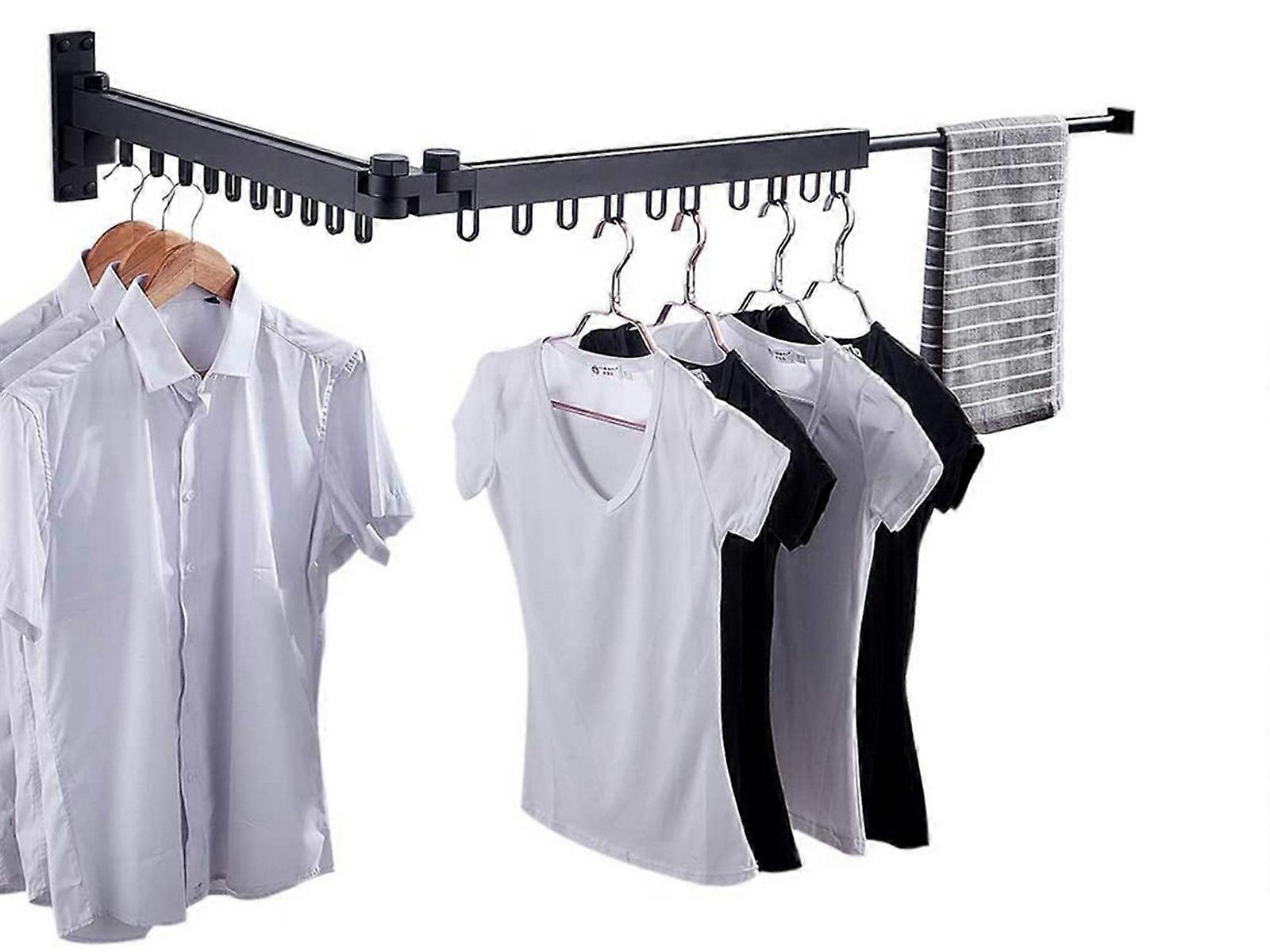Type: Laundry Drying Rack, Folding Clothes Drying Rack, Garment Hanger, Folding Clothes Hanger, Space Saver Clothes Rack Description: This wall mounted clothes drying rack allows you to make full use of your space, unfold when you use it, and fold it against the wall when not in use Highlights: With solid windproof loops allow you to do drying items in windy weather 180 degree rotating arm and 360 degree adjustable joints Comes with extra built-in retractable towel bar Foldable and space saving Not easy to rust and temperature resistant Adjust the drying direction freely and free up floor space Can be used for bedroom, bathroom, balcony, yard drying clothes Features: Material: Aluminum Color: Black Length: 84cm Package Contents: 1 x Folding Clothes Drying Rack
