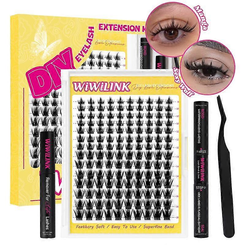 WiWiLink Sunset Manga Lashes Cluster C D Curl DIY Lash Extension Kit and Lash Clusters 8-18mm with Bond Seal and Remover - Ultra-Thin Transp