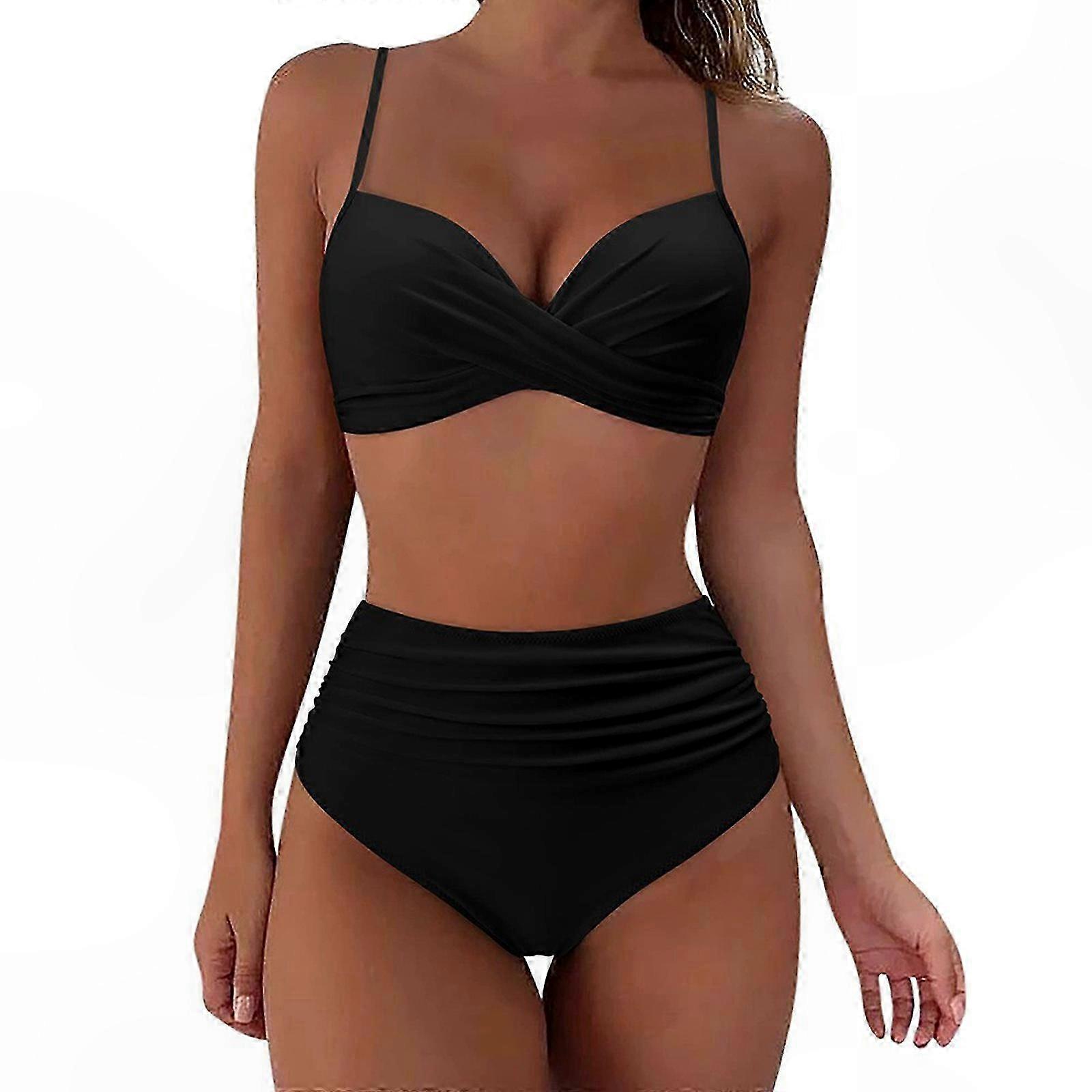 Women's Ruched V-Neck Two-Piece Swimsuit with High Waist and Push-Up Design in Rose Red XL Size