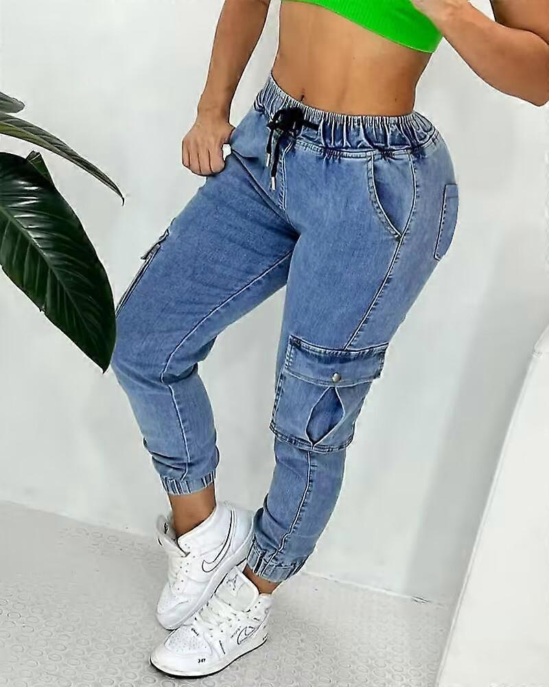 Y2k Women's Pants Summer 2023 Fashion Drawstring Feet Pocket Panel Slim Fit Jeans Casual Skinny Denim Trousers Streetwear Basics