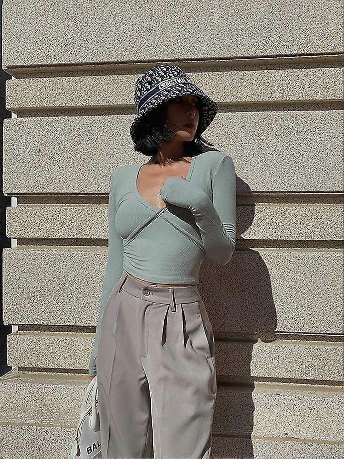 YOUGANG high quality Homemade hot girl super love sexy deep V low-cut cross open finger long sleeve T-shirt slimming waist outer wear bottoming shirt