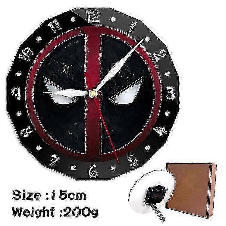 Product Clock, design: Deadpool Size: Diameter 15CM, weight: about 200G Packing: 15x16.5x5cm carton Note: This product needs to be installed with No. 5 (AA) battery (for transportation safety: shipped without batteries) Note: Due to the light and screen setting difference, the item's color may be slightly different from the pictures. Please allow slight dimension difference due to different manual measurement.